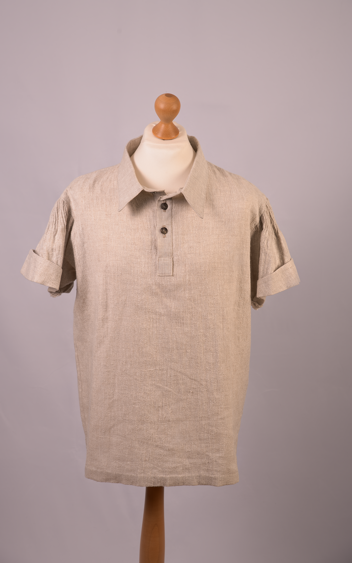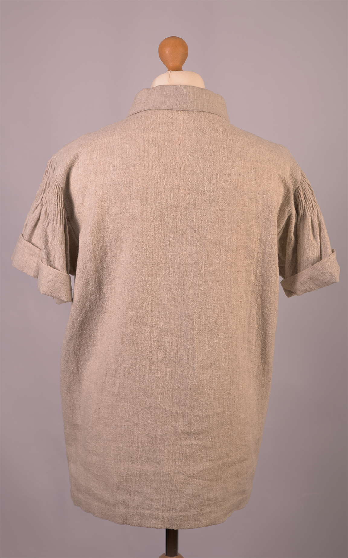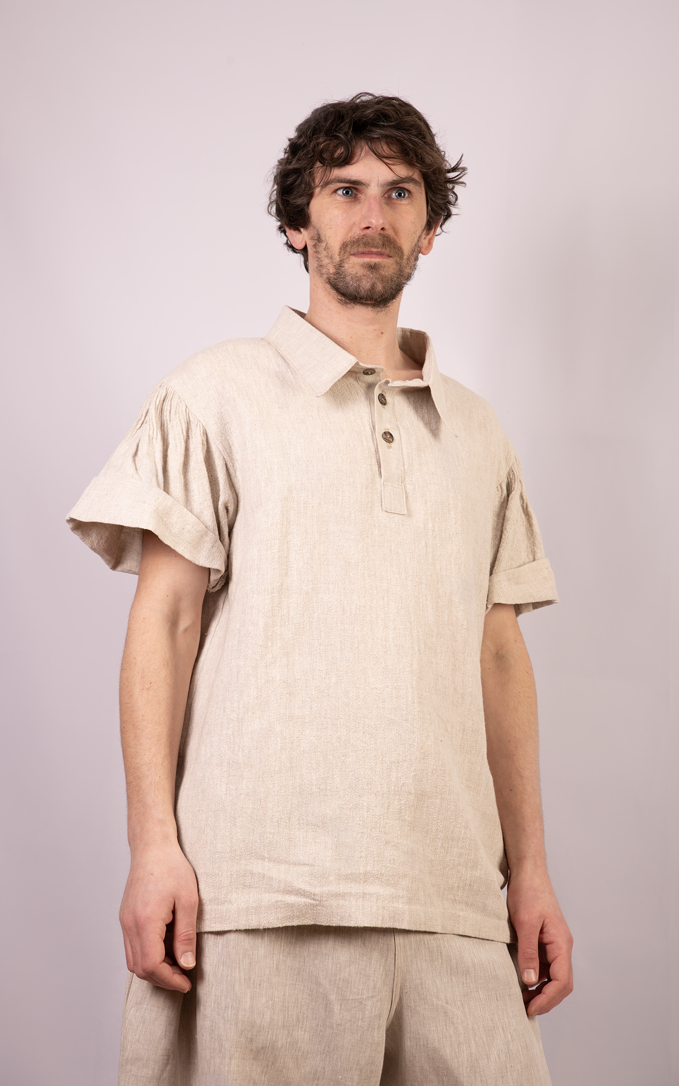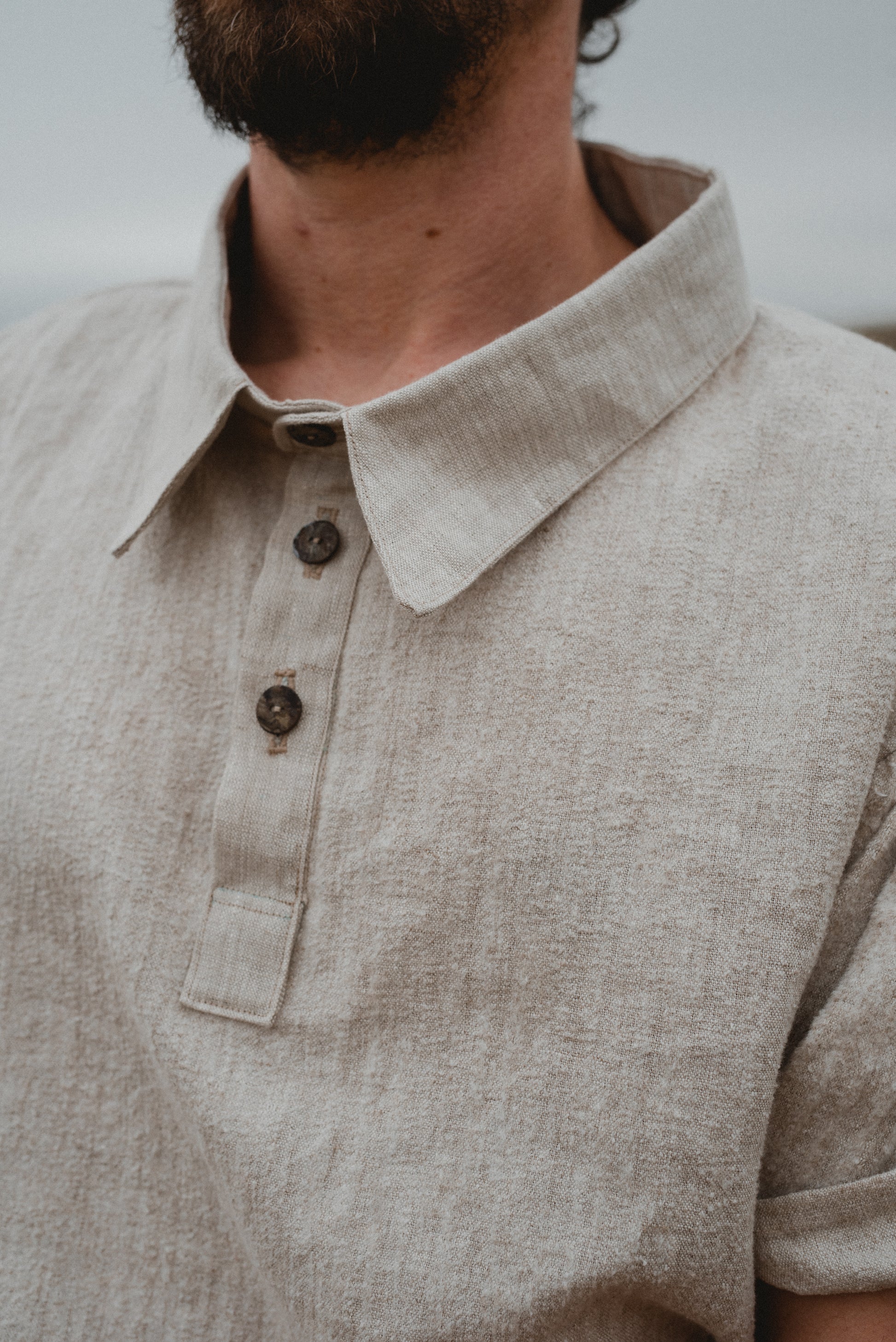 Smart polo with pleated detail. 100% linen featuring reversed mother of pearl buttons. Elegant, comfortable and casual